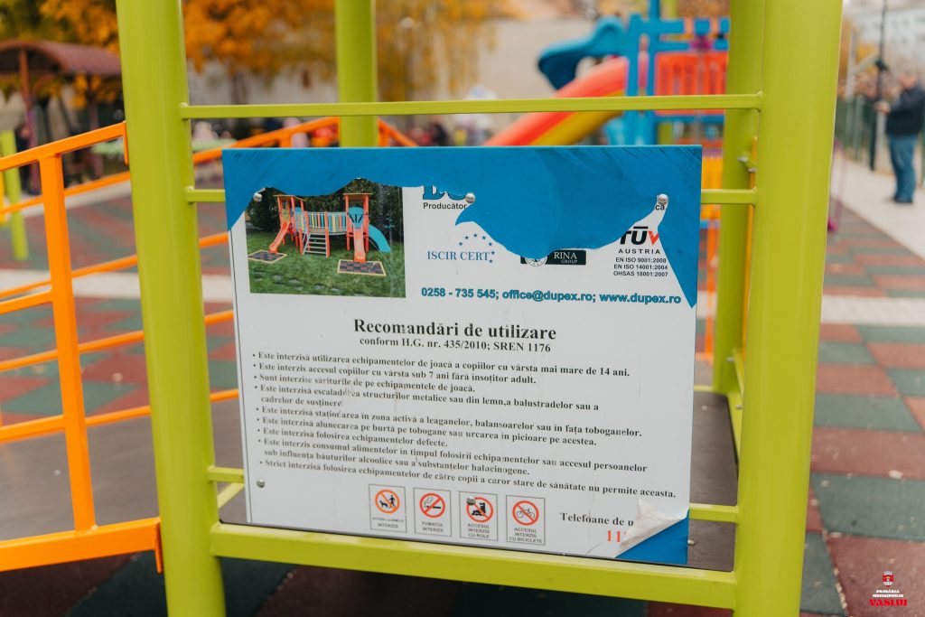 Primăria Municipiului Vaslui face un apel către părinți, bunici și tineri să respecte regulile afișate în parcurile de joacă ale orașului. Echipamentele sunt instalate pentru siguranța copiilor și trebuie utilizate conform H.G. nr. 435/2010 și SR EN 1176.
