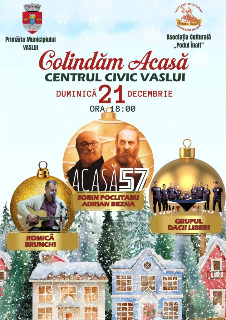 Vasluienii sunt invitați duminică, 21 decembrie, de la ora 18:00, în Centrul Civic, la evenimentul „Colindăm Acasă”, un spectacol dedicat sărbătorilor de iarnă, care îmbină muzica, poezia și emoția autentică a Crăciunului trăit „acasă”.