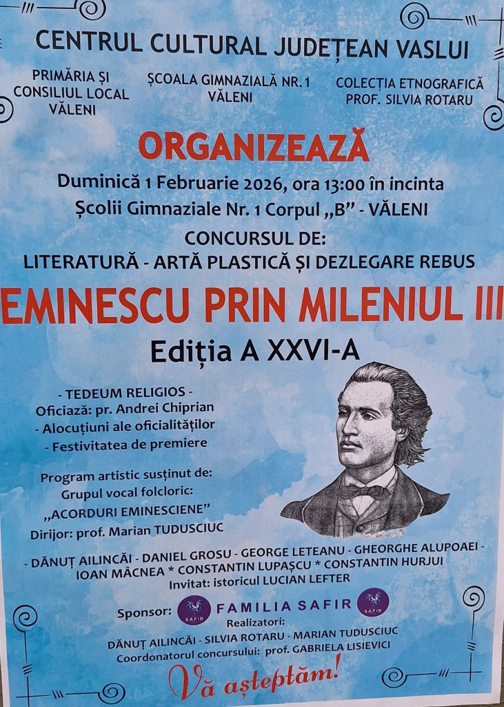 Centrul Cultural Județean Vaslui, în parteneriat cu Școala Gimnazială Nr. 1 Văleni și Primăria comunei Văleni, organizează cea de-a XXVI-a ediție a Festivalului-Concurs „Eminescu prin mileniul III”, eveniment devenit deja o tradiție cultural-educațională pentru comunitatea locală și nu numai.