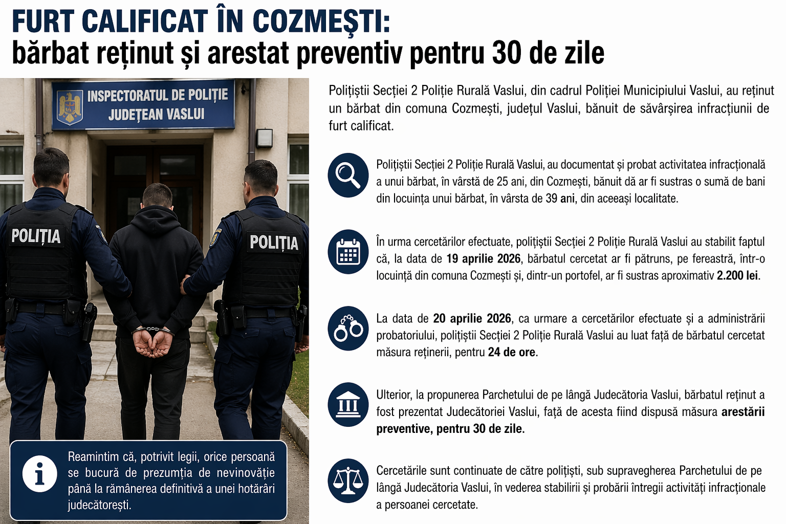 A ignorat ordinul de protecție și a intrat peste propria mamă! Bărbat din Vaslui, arestat după două flagrante în 24 de ore