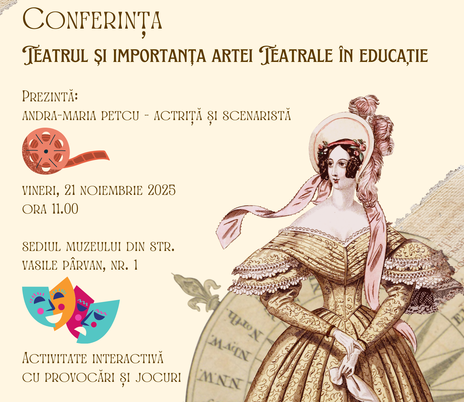 Muzeul „Vasile Pârvan” Bârlad continuă să promoveze cultura vie și educația prin artă! Vineri, 21 noiembrie 2025, de la ora 11.00, instituția găzduiește conferința interactivă „Teatrul și importanța artei teatrale în educație”, susținută de Andra-Maria Petcu, specialistă în Artele spectacolului de teatru și comunicare artistică.