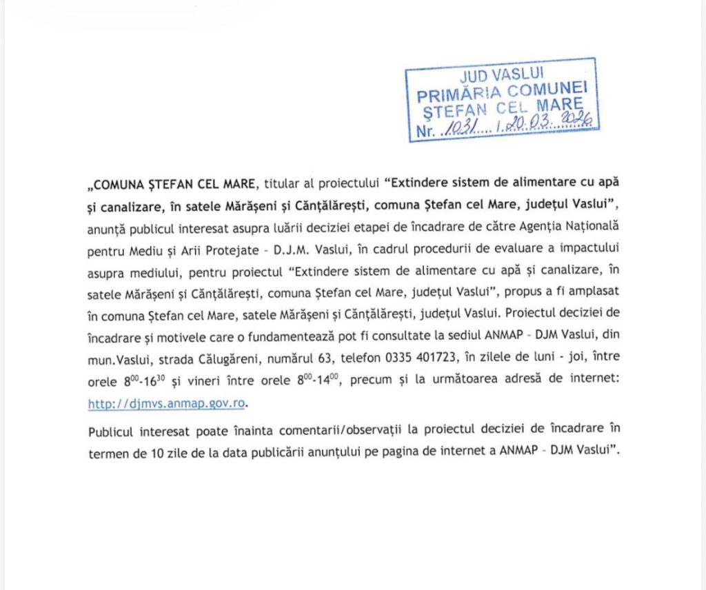 Anunt “COMUNA ȘTEFAN CEL MARE,anunţă publicul interesat asupra depunerii solicitării de emitere a acordului de mediu pentru proiectul „Extinderea rețelei de…